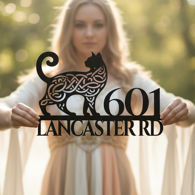 Mysterious and watchful, the Celtic Cat metal address sign brings quiet strength and ancient symbolism to your entrance. Intricate knotwork forms a design that feels both protective and refined. This custom steel house number sign turns your home into a domain marked by independence and subtle power.