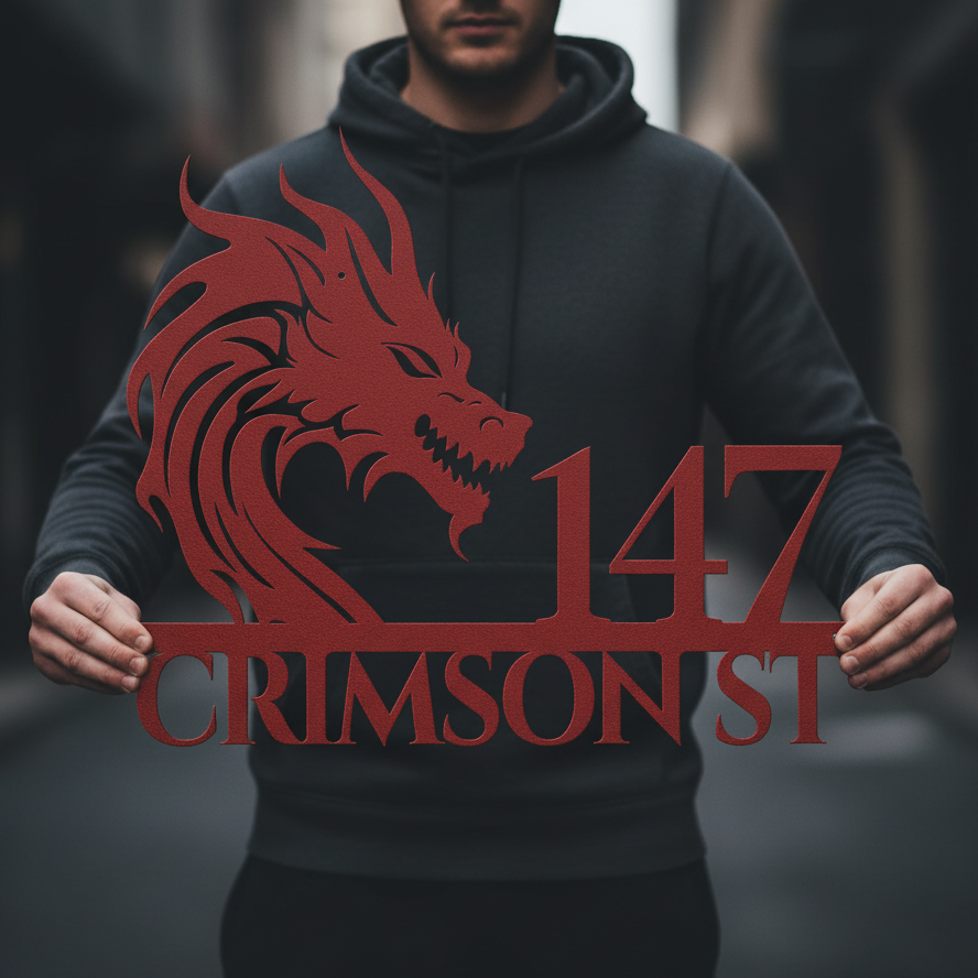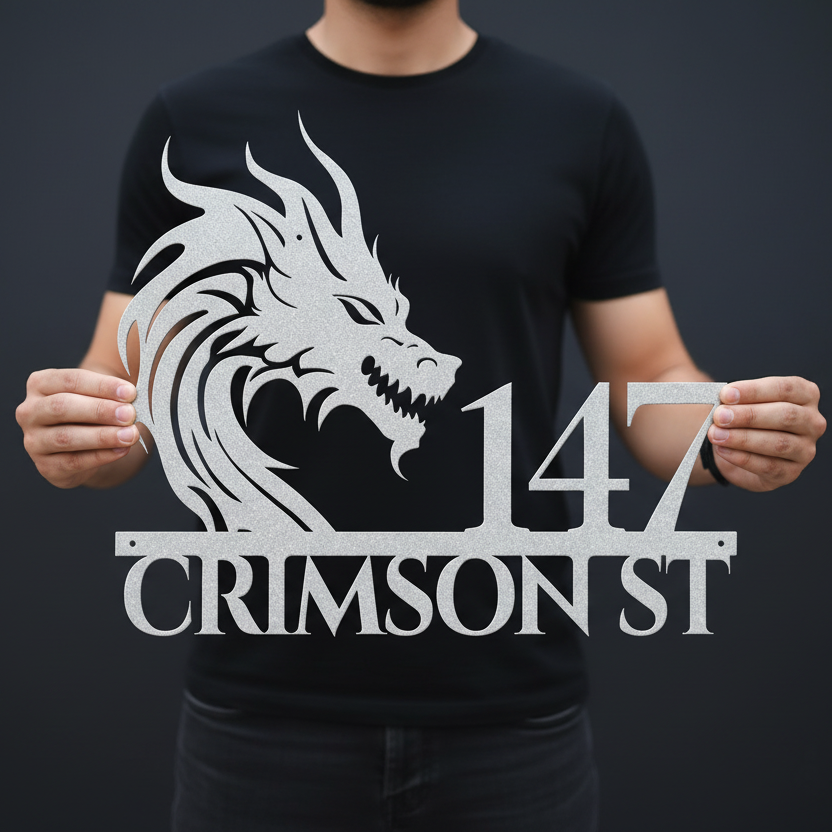 Fierce and commanding, the Dragon metal address sign transforms your entrance into a realm of legend. A symbol of protection, fire, and power, this personalized house number sign rises boldly in steel. It is not merely an address marker — it is a declaration of presence.
